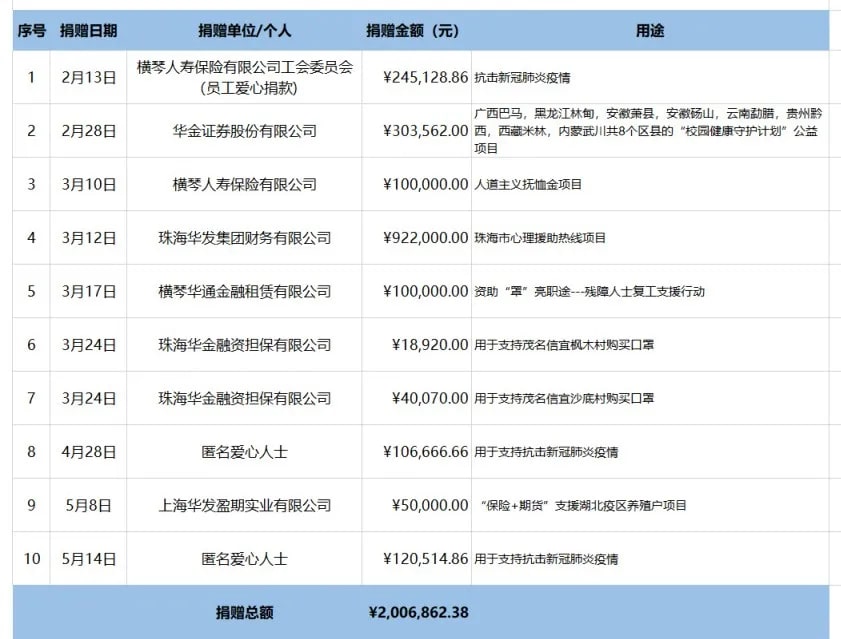 在此,衷心感谢各位爱心人士、爱心企业对公益慈善事业的大力支持,现将华发公益基金会抗击疫情捐赠情况予以公示,接受社会各界监督。详情如下: