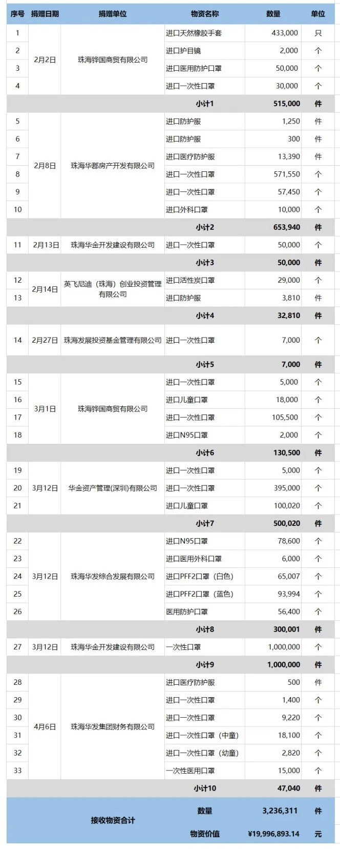 华发公益基金会抗击疫情捐赠情况公示